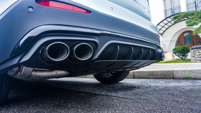 車型后部設計簡潔而精致,同樣是全面黑化處理。熏黑LED尾燈的設計使整個車尾更加立體感十足。后備箱非常平整,支持4/2/4分別放倒。后杠下方的空氣套件讓車看上去非常戰(zhàn)斗,另外車輛使用了雙邊雙出排氣。