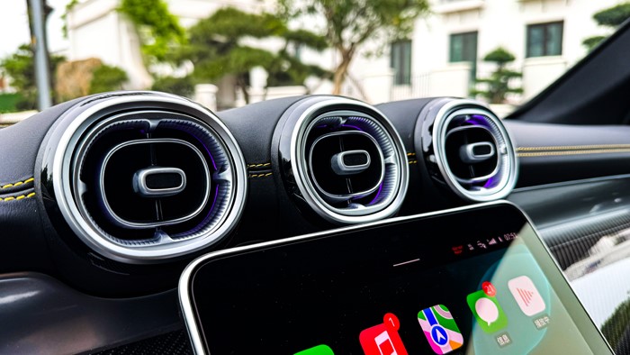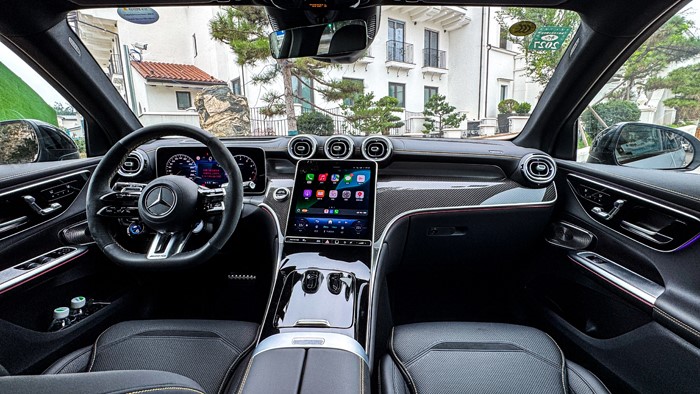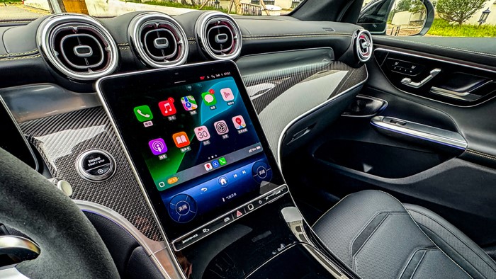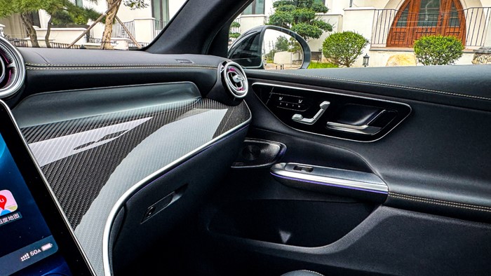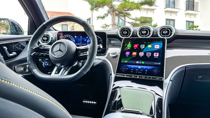 進入車內,奔馳2025款 AMG GLC 43 4MATIC的中控臺采用黑黃配色,加上碳纖維材質的運用讓視覺上感覺非常戰(zhàn)斗,細節(jié)方面的處理也顯示出大廠的功底。