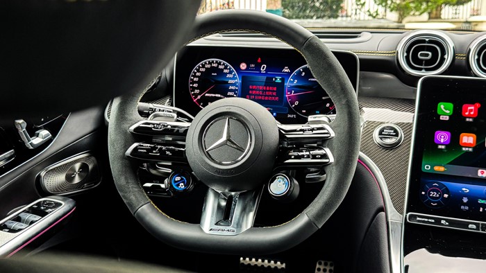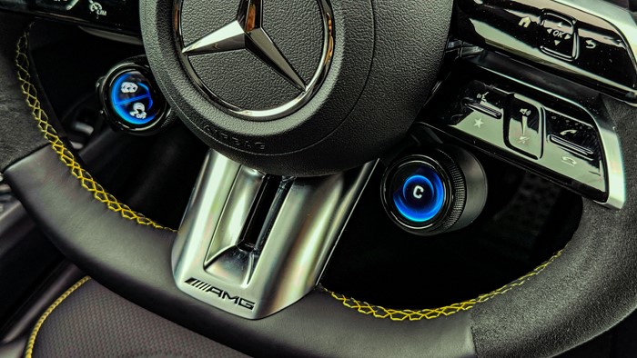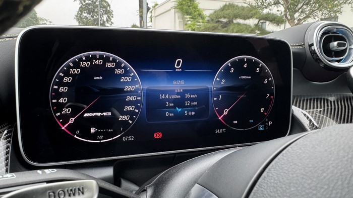 12.3英寸的儀表盤采用全液晶顯示屏,顯示清晰,操作簡便。AMG方向盤選用麂皮與真皮相拼的款式,黃色砸線非常凸顯運動感,握感也很舒適。方向盤上的快速切換單元方便駕駛者隨時轉成:戰(zhàn)斗模式。