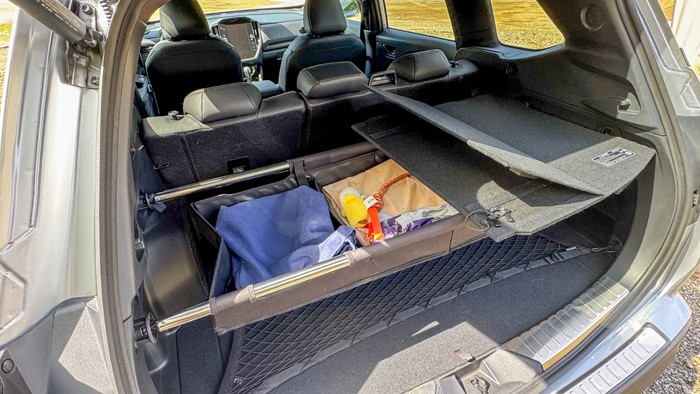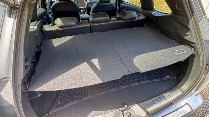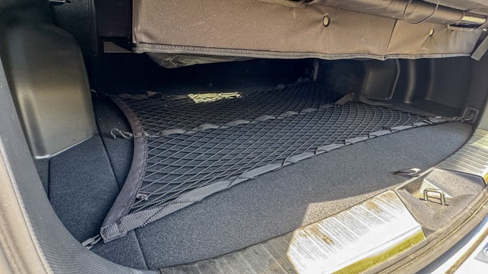 后備箱空間非常平整,座椅可4/6分別放倒,形成的載物空間非常平整,放倒后的載物空間可達(dá)1666升。特裝版車型加入了懸浮式儲物盒的設(shè)計(jì),這也是原廠配件,通過掛鉤可以將隔板抬起,三個(gè)儲物格可以放置零食或雜物。隔板承重5公斤,儲物盒下方還配備了固定行李的網(wǎng)兜。當(dāng)然該系統(tǒng)支持快拆,軟布材質(zhì)收納也不占空間。