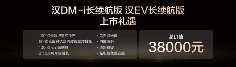 此次,漢DM-i長(zhǎng)續(xù)航版共推出4款車型,補(bǔ)貼后售價(jià)15.98萬(wàn)~18.98萬(wàn)元;漢EV長(zhǎng)續(xù)航版共推出3款車型,補(bǔ)貼后售價(jià)17.38萬(wàn)~20.58萬(wàn)元(10月31日前完成購(gòu)車可享1萬(wàn)元超級(jí)置換補(bǔ)貼)。同時(shí),比亞迪還為用戶準(zhǔn)備了包含置換補(bǔ)貼在內(nèi)的至高價(jià)值3.8萬(wàn)元七大禮遇。