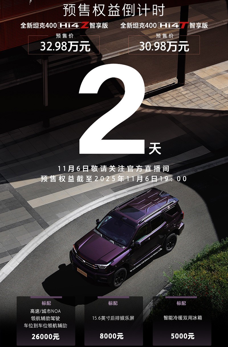 官方公布,新款坦克400將11月6日上市。新車已經(jīng)開始預(yù)售,預(yù)售價(jià)30.98-32.98萬。